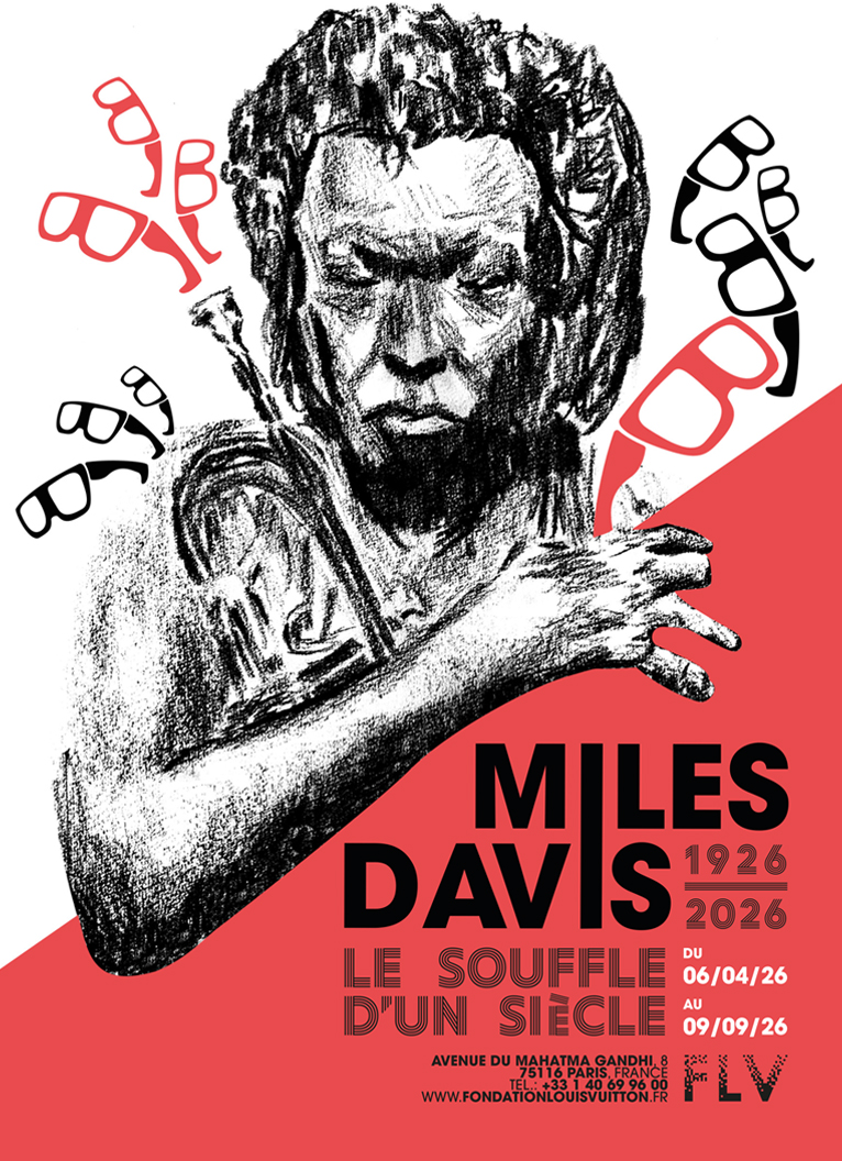 Exercice de dessin et de mise en page pour l’exposition fictive « Miles Davis, le souffle d’un siècle » à la Fondation Louis Vuitton. Le portrait est réalisé à la mine graphiste grasse et contraste avec les différents éléments graphiques en aplats, apportés par la mise en page de l’affiche.